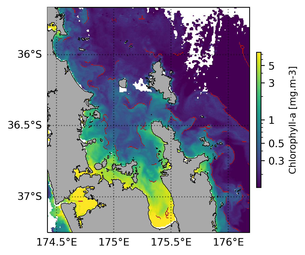 Example of output, overlaying chlorophyll-a (viridis collormap) and fronts (red)